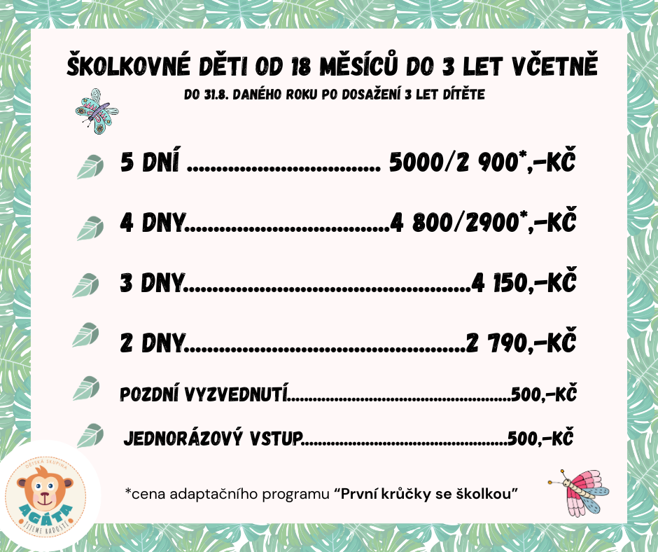 pobyt dítěte v provozní době od 7:00 - 16:00 hodin, pitný režim, čerstvé ovoce, výtvarné a kreativní potřeby, praní lůžkovin, hygienické potřeby (kapesníky, ručníky apod.), pravidelné kulturní akce ve školce.